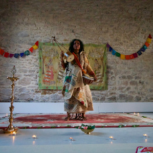 The medieval chapel is holding in its apse a grave of a woman devotee, hidden under the stone paved floor, and the feminine energy irradiating from its presence has inspired Emmanuelle to choose, as theme for the evening, songs to the Divine Mother. We place an old wooden statue of Virgin Mary on the center of the altar, decorated the « stage » with flowers and candles, and while Emmanuelle, beautiful as an ancient priestess in her simple yellow cotton sari, is standing in the middle of the church welcoming the spectators in a very intense silence of hers, we realize that the flow of people where not diminishing, and soon there was no more seated place available ! Other volonteers and myself stood up and helped to squeeze people in every available corner of the temple…